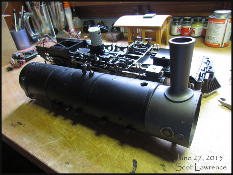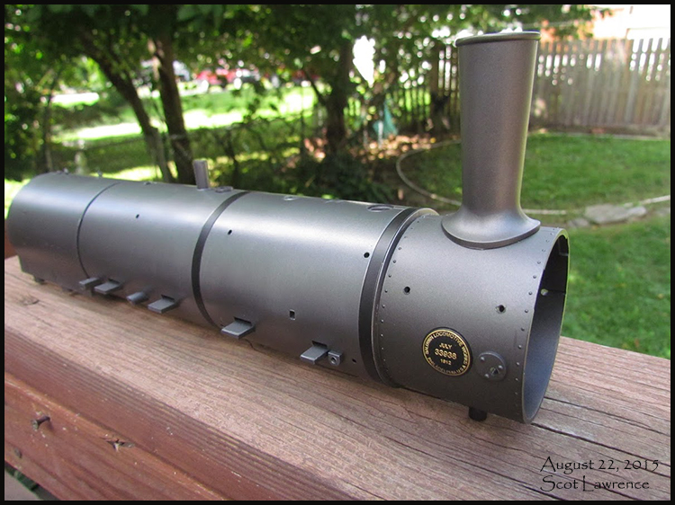 Got the Russia Iron applied! I used Testors Model Master buffing metalizer paint, in the spray can. I tested out "Stainless Steel" and "Gunmetal". The Stainless Steel was too light, but the Gunmetal, No. 1455, was perfect. ![]() ![]() I waited for a cool and low-ish humidity summer day. (about 75F (24C) and 50% humidity, gorgeous weather for August!), and following the directions on the can, sprayed the boiler outdoors, waited an hour, then buffed it out with an old soft t-shirt cut up into strips. It turned out really nice! Im very happy with the results: ![]()