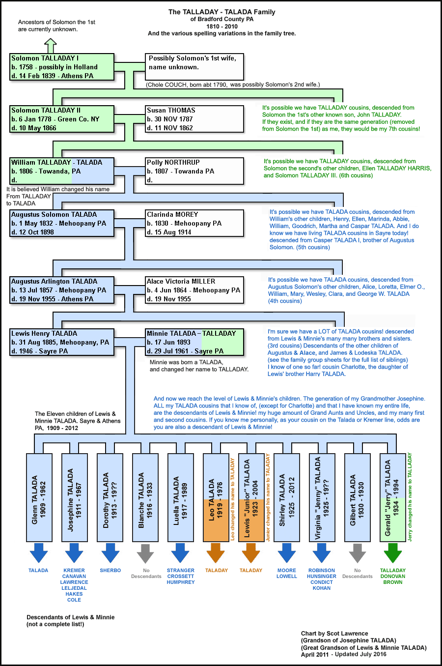 Going back to when William first changed the spelling from TALLADAY to TALADA, around the 1820's, a legend developed among the (even then, very extended) Talada-Talladay clan that "We TALADA's are NOT related to "those" TALLADAYS" and "We TALLADAY's arent related to "those" TALADA's"..perhaps there was "bad blood"..family feuds..who knows! but the legend was born in the early 1800's in Bradford County PA, and soon enough it was believed to be a fact..it probably is not a fact! but many people believed that it was.. So perhaps, several generations later, when Minnie TALADA wished to marry her second cousin Lewis TALADA (which as I explained above, isn't really that big a deal biologically, or even morally) but still..it would likely be considered a "scandal" that they had the same last name! a little bit *too* obvious that they were perhaps *too* closely related..(plenty of second cousins *dont* have the same last name, which would make things easier for them..but in this case they did have the same name) So perhaps they knew well the family myth that "Those Taladas and them Talladays arent related", and in order to "save face" and avoid scandal, community gossip and wagging tongues, Minnie decided to simply change her spelling, which instantly removed all traces of perceived impropriety..because afterall, everyone knows the Talada's and the Talladay's arent related! problem solved.. So thats the best theory I can come up with, to explain how Minne, born a TALADA, became a TALLADAY. its just a guess! but its the best I have for now..If anyone has any other ideas, please let me know! Historically of course, Minnie WAS descended from TALLADAY's! (as we all are)..which might have been a factor in her three youngest sons *also* changing their own names! All the children of Lewis & Minnie were born TALADA's, Jerry's birth certificate proves this, plus all the daughters were known to be Taladas, so this isnt in question. Lewis was always a TALADA, Minnie changed her name to TALLADAY, and all their children were given the name TALADA at birth. But then, probably about the 1950's, the three youngest brothers also changed their name! as discussed above: 3. Leo TALADA (changed his name to) Leo TALADAY 4. Lewis "Junior" TALADA (changed his name to) Lewis "Junior" TALADAY 5. Gerald "Jerry" TALADA (changed his name to) Gerald "Jerry" TALLADAY So thats 5 people in our extended family tree (who we know of for sure) that changed their spelling. William was the first, from TALLADAY to TALADA, then Minnie, from TALADA back to TALLADAY! and then three of Lewis & Minnie's sons. Why did Leo, Junior and Jerry change the spelling of their own names? We dont know..I have asked some of my cousins about it , Jerry's children, and also Aunt Shirley, (the only surviving child of Lewis & Minnie in 2011) and no one knows..Junior has a son, David, who I hope to contact. (I always say 'Aunt Shirley"..because that is what everyone calls her..but she is actually my Mothers aunt! Shirley is my Grand Aunt..sister of my Grandmother Josephine) Today I know I have cousins, living descandants of Leo, Junior, and Jerry, who are TALLADAY's and TALADAY's.. So there we are! The knot is hopefully mostly untangled..although we still have a lot of unknowns in this story! The biggest unknowns being WHY did everyone change their names?! Hopefully more research will continue, to tell more chapters of this story.. A new chart, showing everything discussed above: |