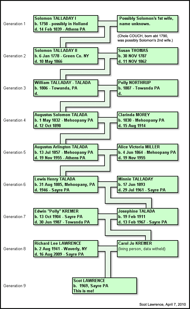 but here is what I do know: The original spelling is TALLADAY..this is not in question. This goes back to the patriarch of my TALLADAY line in Athens, PA, Solomon Talladay, (1758-1839) who was the first of the line to settle in Athens, and is buried in Old Riverside Cemetery in Athens. His gravestone is clearly marked TALLADAY. At some point, one of his descendants chose to change the spelling from TALLADAY to TALADA. Exactly who this was, and why they did it, im not yet fully certain. But one of my sources [106] indicates it might have been Augustus Solomon TALLADAY born in 1832 (The Great Grandson of the original Solomon) who might have been the first to use TALADA. If this is correct, it checks out with the spelling on the gravestones of my ancestors in Tioga Point Cemetery in Athens..Augustus Solomon TALADA (1832-1898) his wife (Clarinda MOREY), their children and descendants all switched to TALADA..the rest remained TALLADAY. (Update - I now suspect it was actually Augustus Solomon Talada's father, William, who was likely the person who changed the spelling..further musings on that are below) This would make my: Great Great Great Grandfather (56) Augustus Solomon TALADA (1832-1898) his son, my Great Great Grandfather (28) Augustus TALADA (1857-1950) his son, my Great Grandfather (14) Lewis TALADA (1884-1946) and his daughter, my Grandmother (7) Josephene TALADA KREMER (1911-1967) all using the spelling TALADA. So that is (probably) where the spelling TALADA got into the mix.. Then something interesting happened..Lewis TALADA married Minnie TALLADAY. (these are my Great Grandparents..and the ancestors of all my TALADA/TALLADAY cousins in Athens/Sayre today) Minnie and Lewis were second cousins..they had a set of Great Grandparents in common. (This is not really "shocking" in any way..this was common in the 17th, 18th, 19th centurys, and 2nd cousins are not as closly related as you might think..With only one set of Great Grandparents in common, they have 14 completely different Great Grandparents, (only 2 are the same) then all eight of their Grandparents are different and unrelated..meaning Lewis & Minnie's children have only two out of 30 ancestors that were "the same".. thats only 6% of their ancestry..quite diluted really..and of course today, after several more generations, the percentage is so miniscule as to be utterly meaningless..) So Minnie's line was always TALLADAY, it never changed. (update, this is now known to be wrong! see below) The children of Lewis & Minnie were given the name TALADA at birth, from their fathers side, which was the side that (probably) changed to TALADA with Lewis' Great Grandfather, William TALADA. Then! one of the eleven children of Lewis and Minnie TALADA, decided to change the spelling back! This was my Grand Uncle Jerry, youngest brother of my Grandmother Josephine. Gerald "Jerry" TALLADAY, a son of Lewis & Minnie. Jerry TALLADAY b. July 21, 1934 d. April 27, 1994 Jerry married Shirley Nichols. Jerry awas given the name TALADA at birth (along with all the other children of Lewis & Minnie) but at some point Jerry purposly changed his own surname to TALLADAY, (with two L's) Today I have a set of cousins, the children of Jerry & Shirley, who are now using the spelling TALLADAY, while all the other descendants of Lewis & Minnie continue to use TALADA. (update..also wrong! ;) keep reading! ;) The source for Jerry changing the spelling back is my Mothers personal knowledge [3], and the headstones in Tioga Point Cemetery also support this conclusion..Jerry & Shirley's stone says "TALLADAY" (except for the stone of Lewis & Minne themselves, which does actually say TALLADAY! which surprises me, because you would expect it should say TALADA...I theorize that Minnie was a strong proponant of the original TALLADAY spelling, since that was her own name, and perhaps that had an influence on one of her sons changing his spelling..Also, Minnie died after Lewis, so it seems she got the final say on the headstone! and she chose Talliday..) My Mom always heard that Jerry changed the spelling from TALADA back to TALLADAY because he felt TALLADAY was the "correct" spelling, and it should be spelled that way based on the heritage of his TALLADAY line.. which makes sense to me, and is something I can understand and respect. We know that Jerry changed the spelling back..what remains a mystery is why William TALADA (b. 1806) changed the spelling to TALADA in the first place! (if he is in fact the person who did it.) why would he do that? what was the reason? it remains a mystery for now.. Update -
